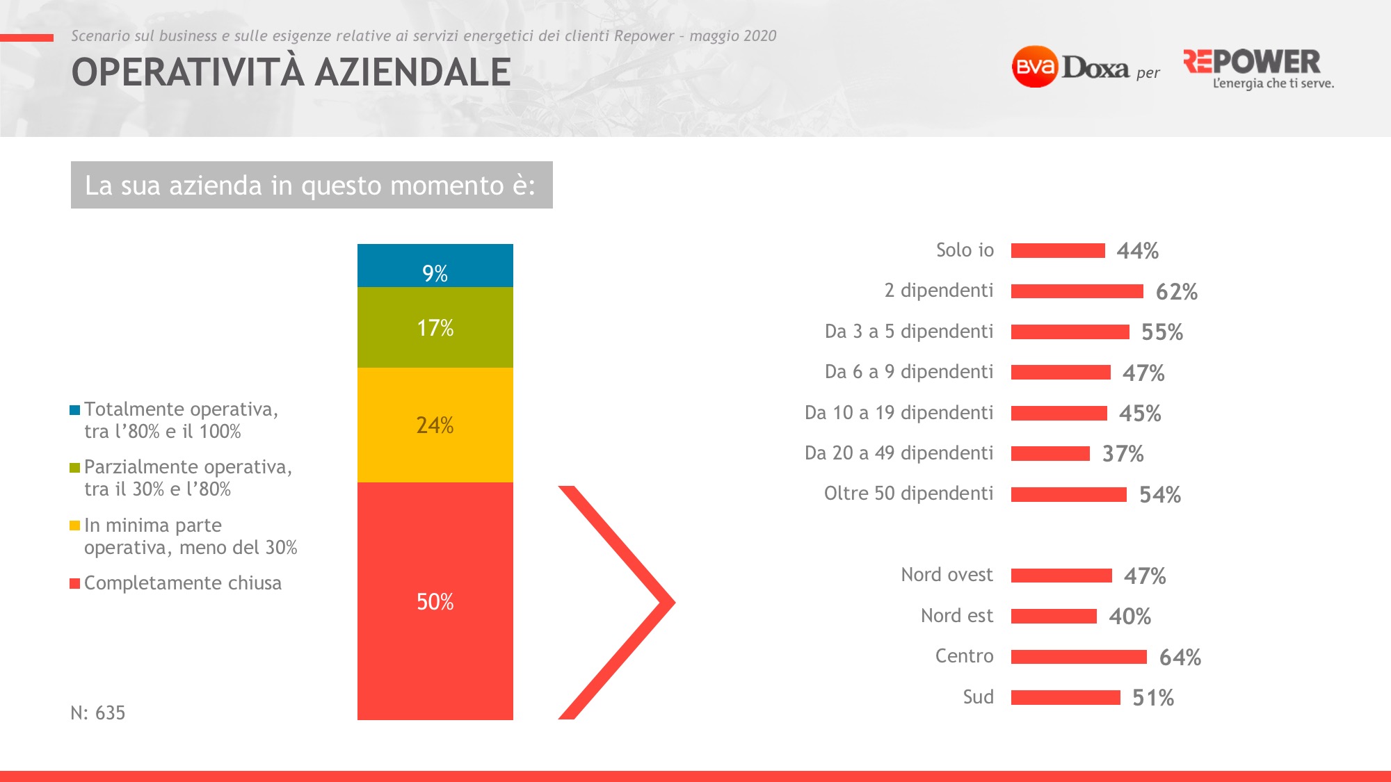 Nella terza settimana di aprile 2020, in pieno lockdown, oltre 600 tra piccole e medie imprese nostre clienti hanno partecipato a un’indagine sullo stato di salute del business, per esplorare e condividere gli impatti immediati del lockdown sulla propria attività e le mutate esigenze lavorative, anche in termini di servizi energetici.
